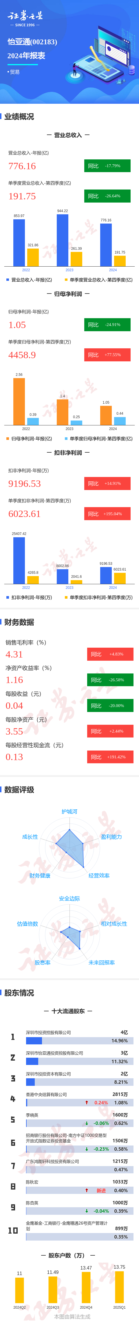 证券之星消息,怡亚通2024年年报显示,公司主营收入776.16亿元,同比下降17.8%;归母净利润1.06亿元,同比下降24.92%;扣非净利润9196.54万元,同比上升14.92%;其中2024年第四季度,公司单季度主营收入191.75亿元,同比下降26.64%;单季度归母净利润4458.9万元,同比上升77.56%;单季度扣非净利润6023.61万元,同比上升195.04%;负债率81.87%,投资收益1.79亿元,财务费用9.74亿元,毛利率4.31%。